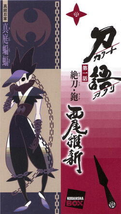 真庭忍軍十二頭領が一人、真庭蝙蝠がとがめとの共闘によって涙磊落から 絶 刀 「鉋」を奪うと、とがめを裏切り 絶 刀 「鉋」を持ち逃げし、真庭忍軍は里ごと幕府から離反。このことによってとがめは一度窮地に陥る。また、幕府の隠密班もこれにより真庭 蝙蝠(マニワ コウモリ) 「無頼の蝙蝠」、身長:5尺9寸4分、体重:15貫1斤、信条:付和雷同 里でも十指に入る実力者だが野心や野望がなく、頭領に選ばれるのを嫌がっていた。皮膚や筋肉を弄くって他人になりすます、「忍法骨肉細工」を使う。 真庭 喰鮫(マニワ クイザメ) 「涙の喰Koumori Maniwa the 1st (真庭(まにわ) 蝙蝠(こうもり) 1世(いっせい), Maniwa Kōmori Issei), also known as Koumori the SelfReliant (無頼(むらい)の蝙蝠(こうもり), Murai no Kōmori), is a character from the Katanagatari Series He is a ninja from the Sengoku Period and one of the first bosses of the Maniwa Ninja Corps